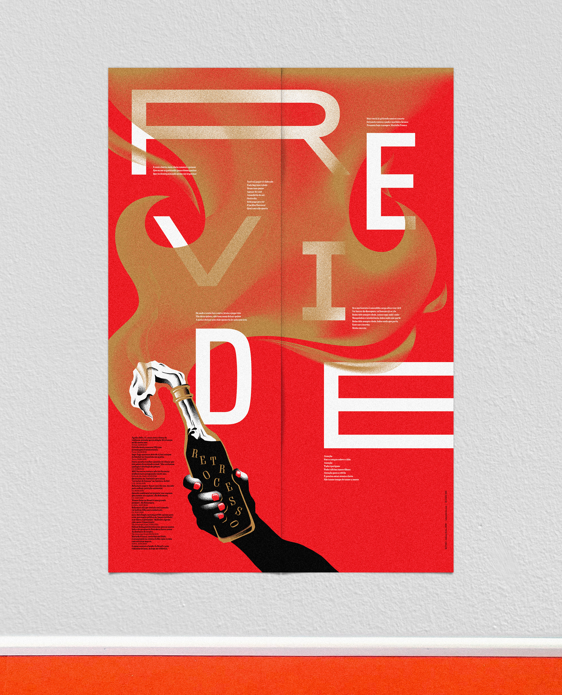 Esse é o REVIDE, minha contribuição para o projeto. A peça fala dos retrocessos que estamos vivendo nos últimos dois anos no Brasil, ilustrado por algumas manchetes reais no canto inferior esquerdo do cartaz. Mas também fala de reação, o REVIDE de quem resiste, seja através da luta nas ruas, ou da arte, da música. AmarElo do Emicida inspirou o título e é uma das 6 músicas que escolhi para compor o cartaz.